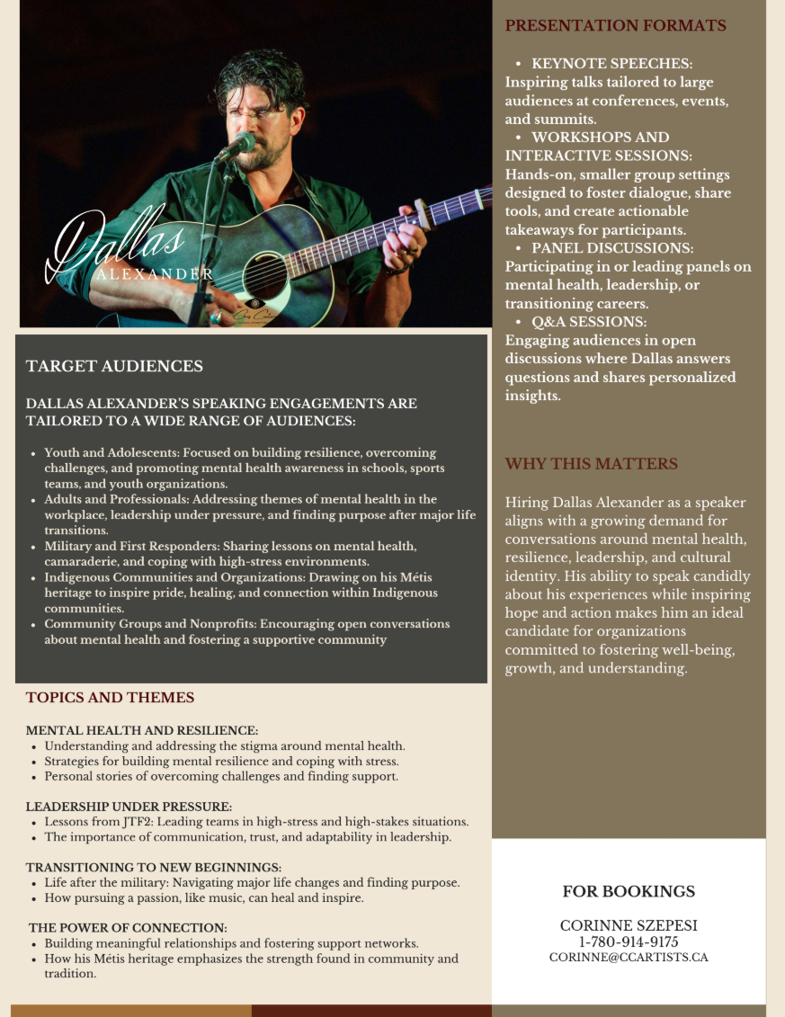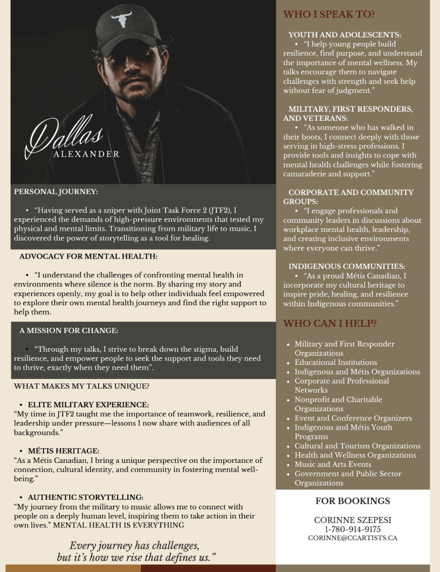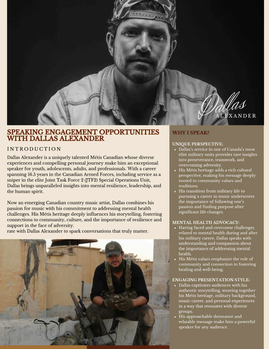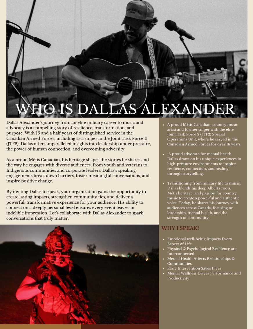 Dallas Alexander is a Nashville-based country artist whose sound fuses the grit of Red Dirt with the edge of Outlaw Country. A former Canadian special operations sniper, Dallas served on an elite JTF2 team holding the world record for the longest confirmed precision shot in military history. That same discipline and intensity now fuels his music, which is as real and unapologetic as the life he’s lived.