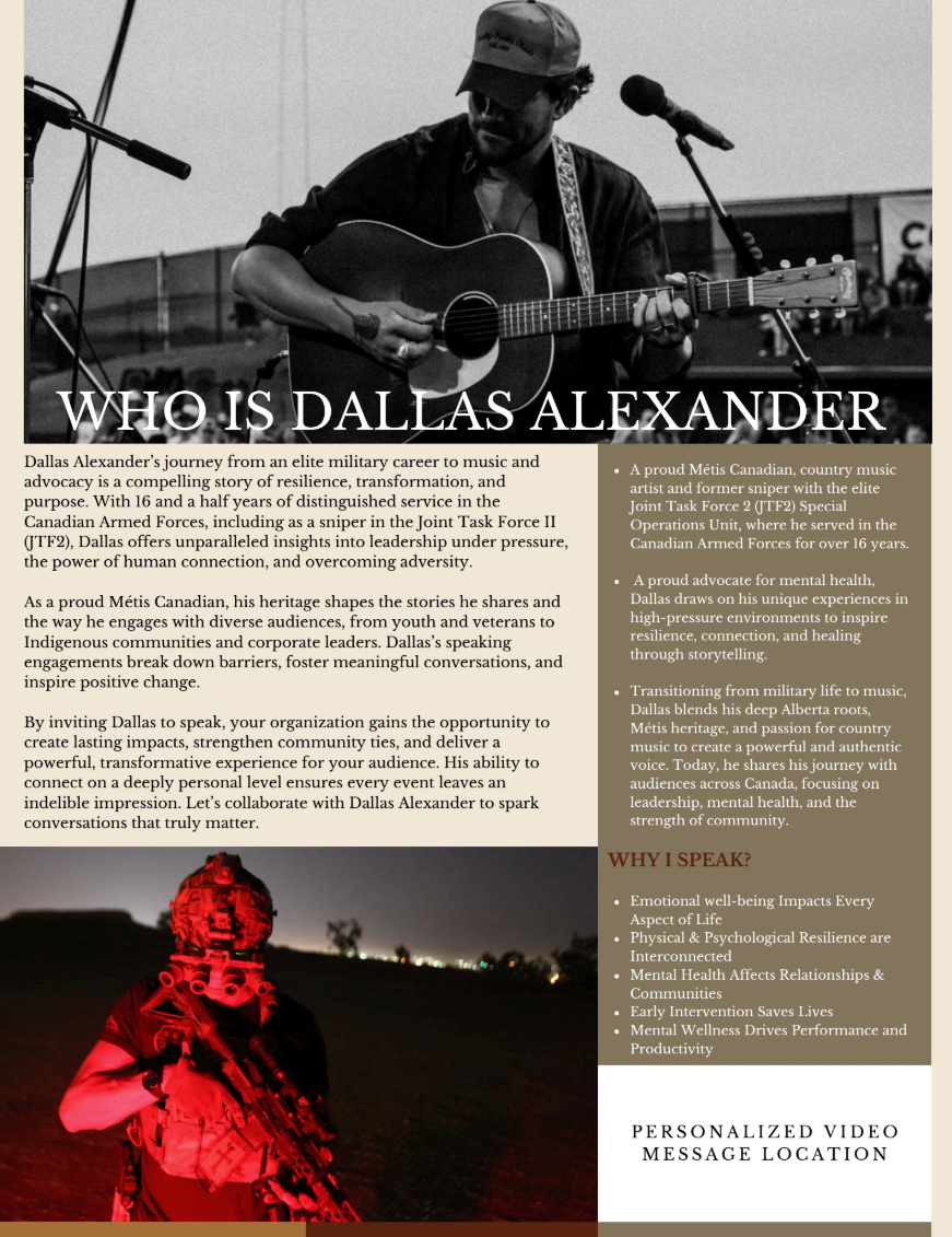 Dallas Alexander is a Nashville-based country artist whose sound fuses the grit of Red Dirt with the edge of Outlaw Country. A former Canadian special operations sniper, Dallas served on an elite JTF2 team holding the world record for the longest confirmed precision shot in military history. That same discipline and intensity now fuels his music, which is as real and unapologetic as the life he’s lived.